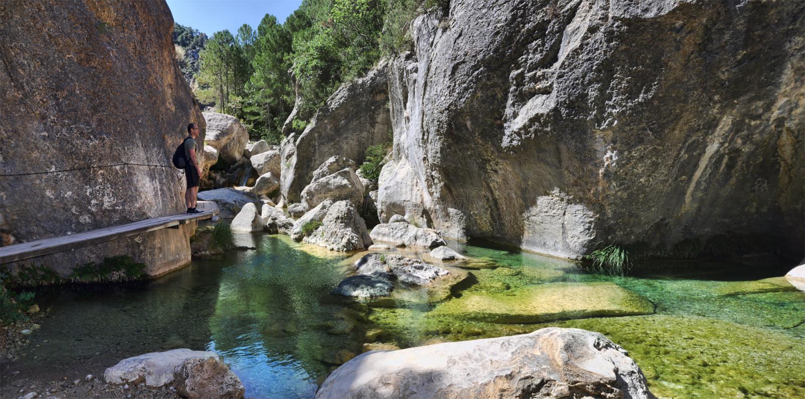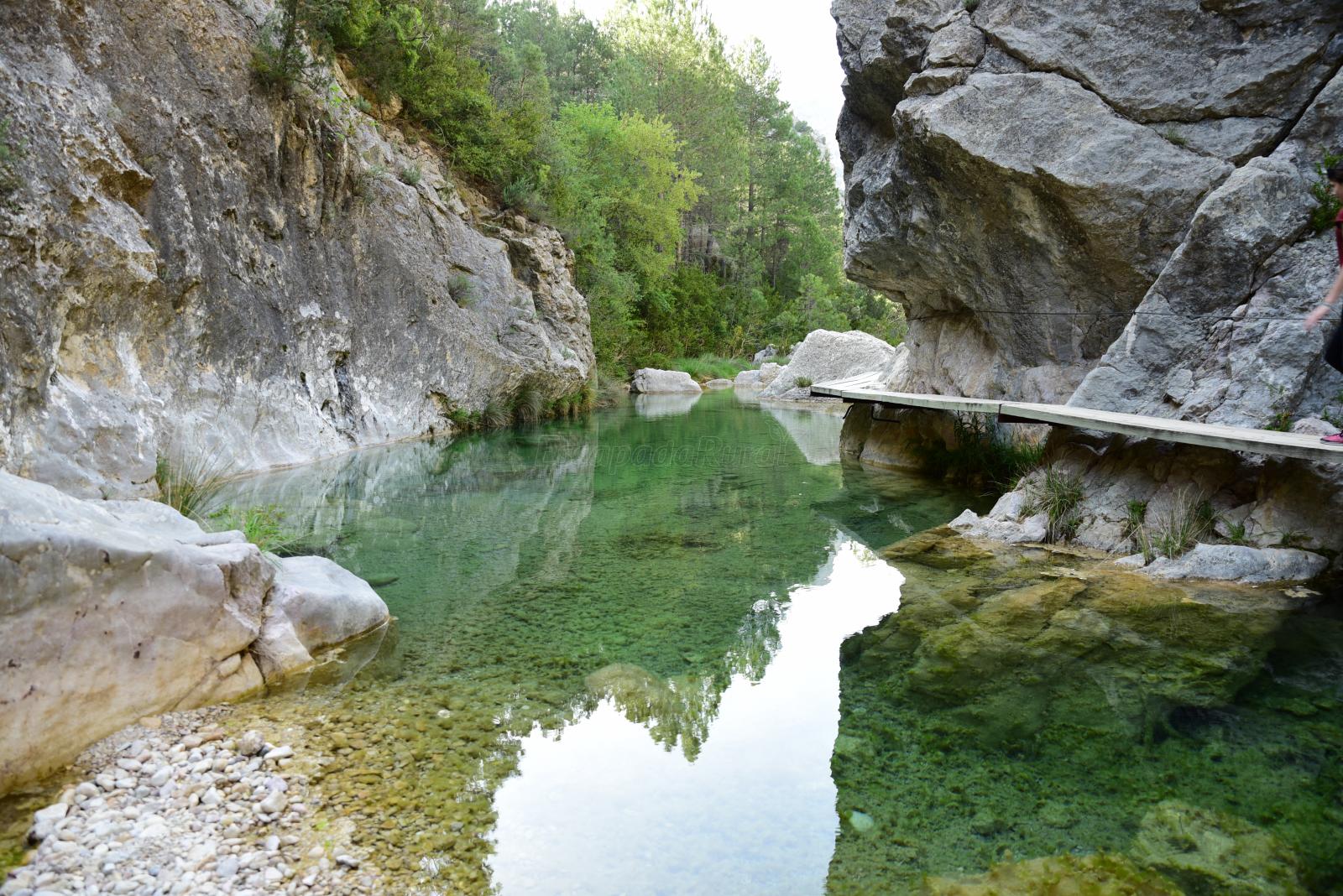 Su gran atractivo reside en las pasarelas de madera que salvan hermosas pozas de aguas cristalinas y de color turquesa.